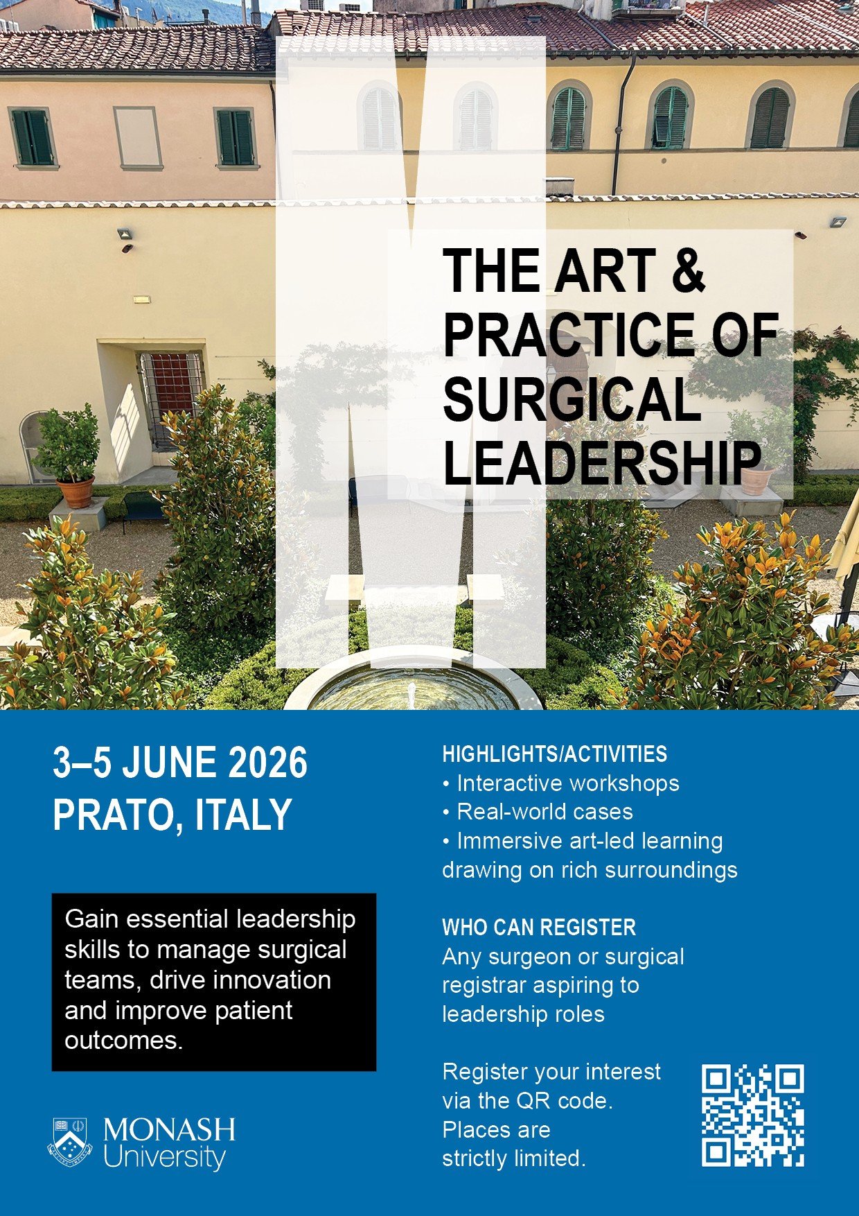 Expressions of interest are now open to attend a Monash University Surgical Leadership Program in Prato, Italy, 3-5 June 2026.